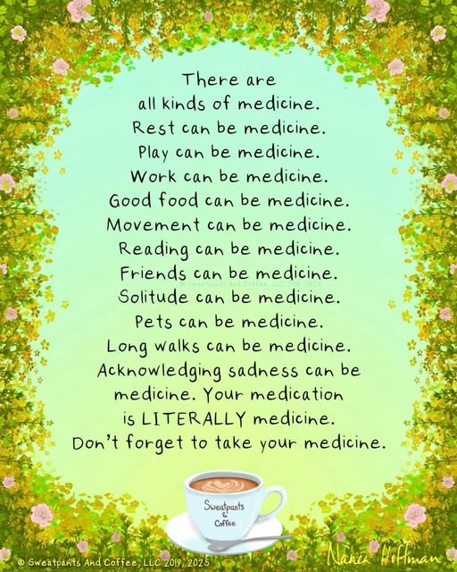 The thirteenth letter of the alphabet is M. I took the liberty of highlighting all the M words in my introductory paragraph. There are lots of good M words. The first one that comes to mind is motherhood. Without mothers where would we be? Nowhere. We wouldn’t exist. It’s strange for me to try and understand misogyny, the hatred of the female gender, when without women, the human race wouldn’t exist. But enough about that. Today I’m going to talk about medicine, not the pills, liquid, injections, and creams prescribed by doctors but the other kind of medicine needed to keep your mind and soul healthy. Enjoy!