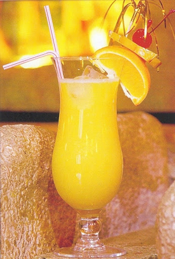 Blend all ingredients together. Pour over ice. Garnish with an orange slice and cherry.