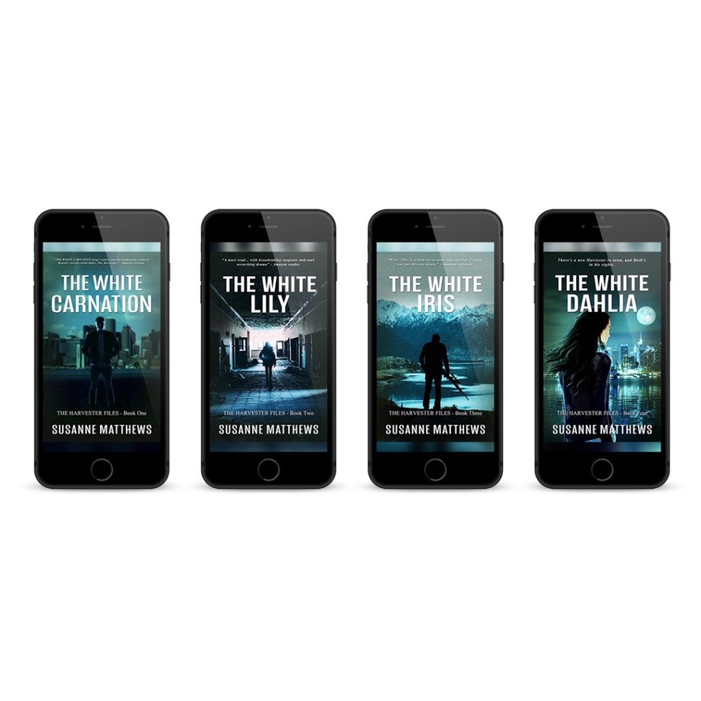 For example, my Harvester Files, The White Carnation, The White Lily, The White Iris, and The White Dahlia have similar covers and titles and should be read in order to get the most out of the series. The covers are dark, and eerie, befittng the stories. If you look closely, the covers have two men and two women on them, depicting the main “hunter” in each story.
