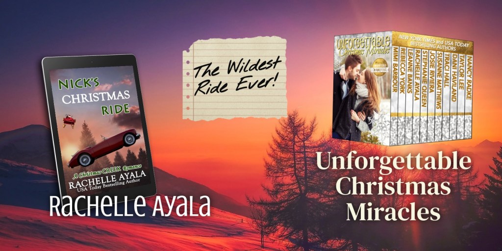 Rachelle Ayala: Nick’s Christmas Ride – Nick Jolly’s antique convertible turns into a wild ride when his best friend and secret crush, Hayley, chooses three social media starlets for his Christmas-promotional dates. Two irascible Texas Hold’em playing ancestors, three social media narcissists, an old-time fiddler, and a flying car seems kind of normal for Nick Jolly and Hayley Brockman’s unexpected Christmas Creek romance. A fun romantic comedy.