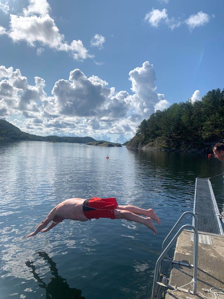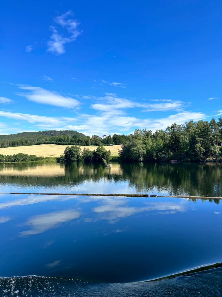 After a stressful departure from Canada, we made it to the first leg of our vacation, his summer house on the fjord. Handyman that he is, he fixed the place up, even building a gorgeous and very modern shower outside. We stayed in the guest house and had a wonderful time. It was cooler than we’d anticipated, but my husband got to go fishing at the mouth of the fjord, help catch the 20 mackerel that made up supper that night, and even go in swimming. Sorry, water that’s 14 degrees Celsius is too cold for me. A family of swans came by to say hello, and the jellyfish which looked to me like a raw egg out of the shell were fascinating. But, when it appeared, I took the time to bask in the sun and soak up some after dinner rays while polishing off my wine.